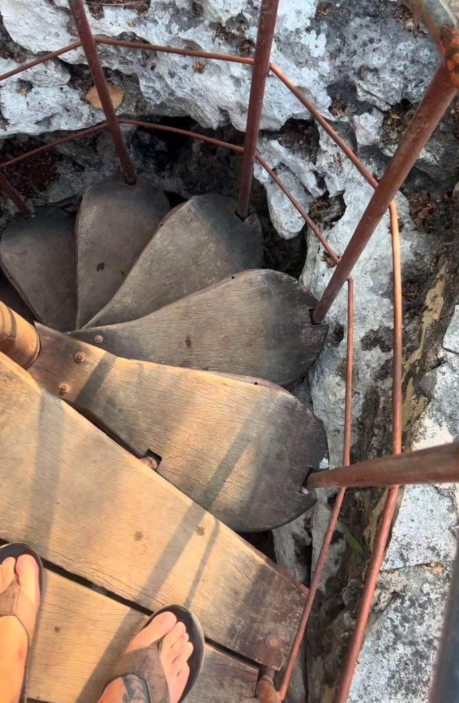 A small walk away along a path surrounded by beautiful trees I was beginning to wonder “where is this cenote?” until my girlfriend stopped and pointed down at the ground to a spiral staircase going into the ground. “Time to go down” I said as she led me into the unknown.